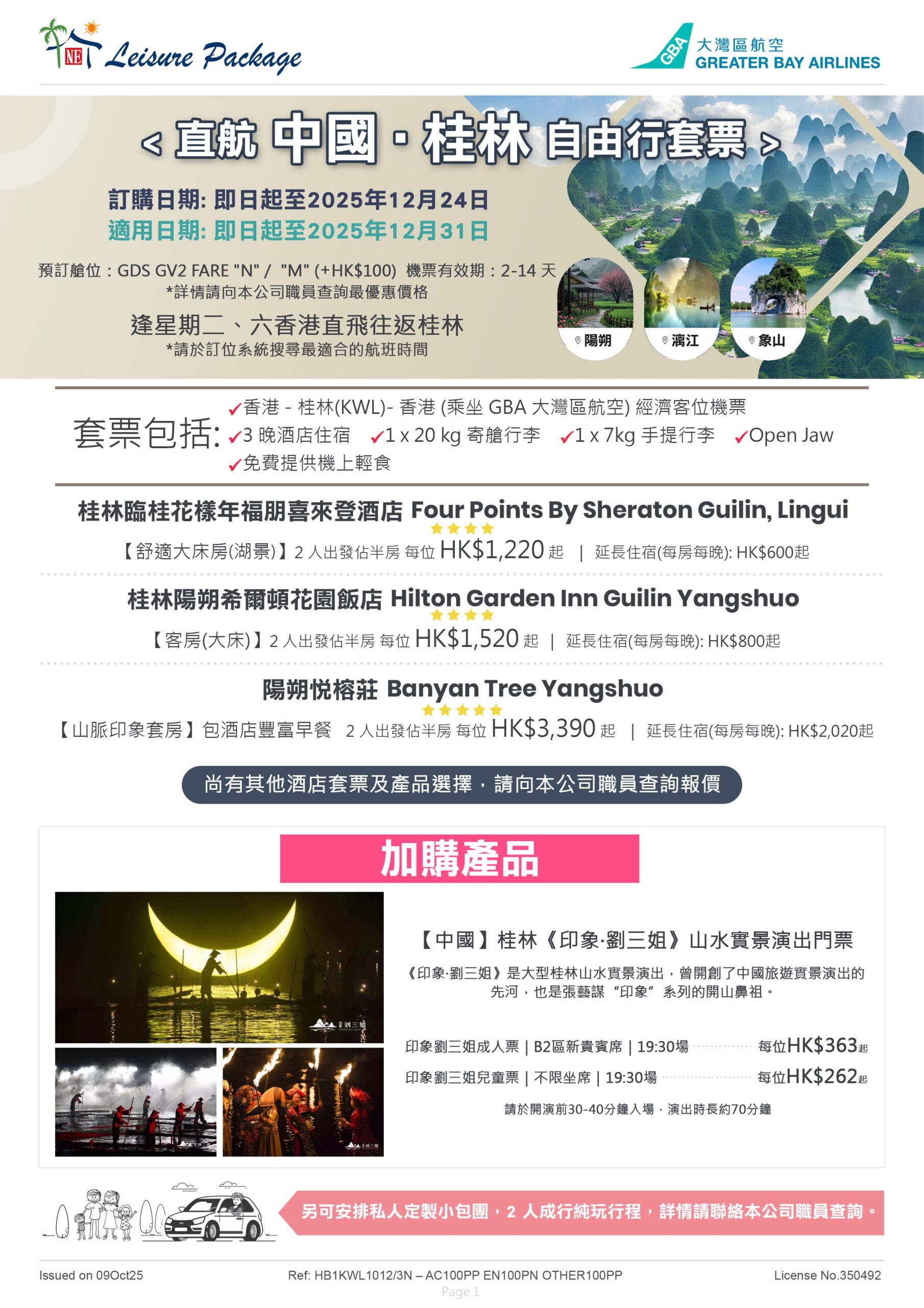 香港-桂林-香港 (乘坐大灣區航空 Greater Bay Airlines) 經濟客位機票