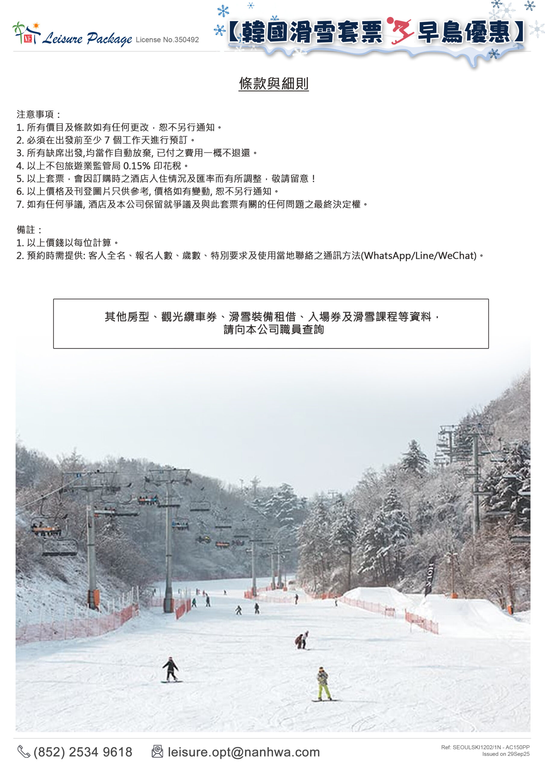 注意事項: 1. 所有價目及條款如有任何更改,恕不另行通知。 2. 必須在出發前至少 7 個工作天進行預訂。 3. 所有缺席出發,均當作自動放棄, 已付之費用一概不退還。 4. 以上不包旅遊業監管局 0.15% 印花稅。 5. 以上套票,會因訂購時之酒店入住情況及匯率而有所調整,敬請留意! 6. 以上價格及刊登圖片只供參考, 價格如有變動, 恕不另行通知。 7. 如有任何爭議, 酒店及本公司保留就爭議及與此套票有關的任何問題之最終決定權。