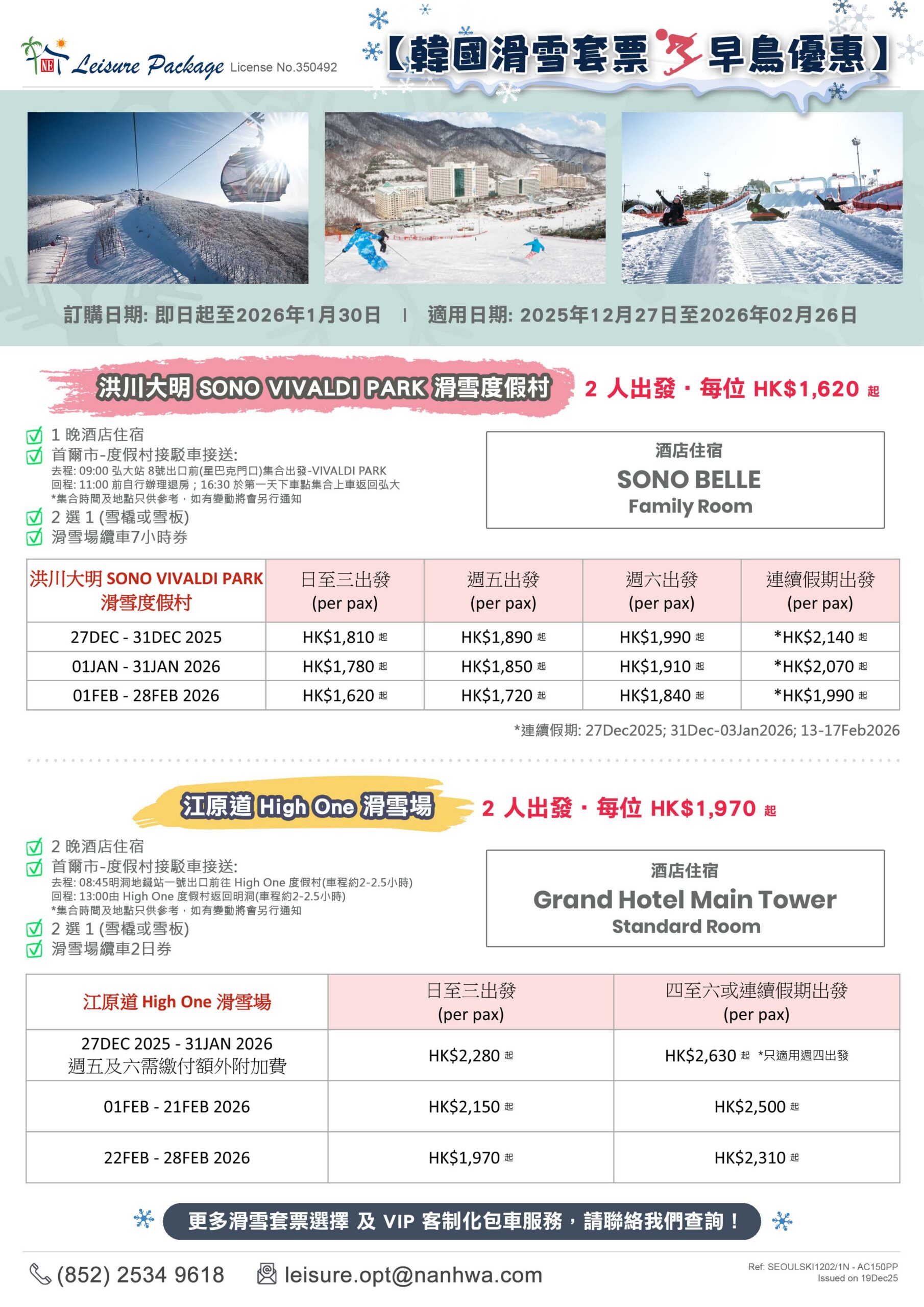 【韓國滑雪套餐 • 早鳥優惠】洪川大明 SONO VIVALDI PARK 滑雪度假村 / 江原道 High One 滑雪場