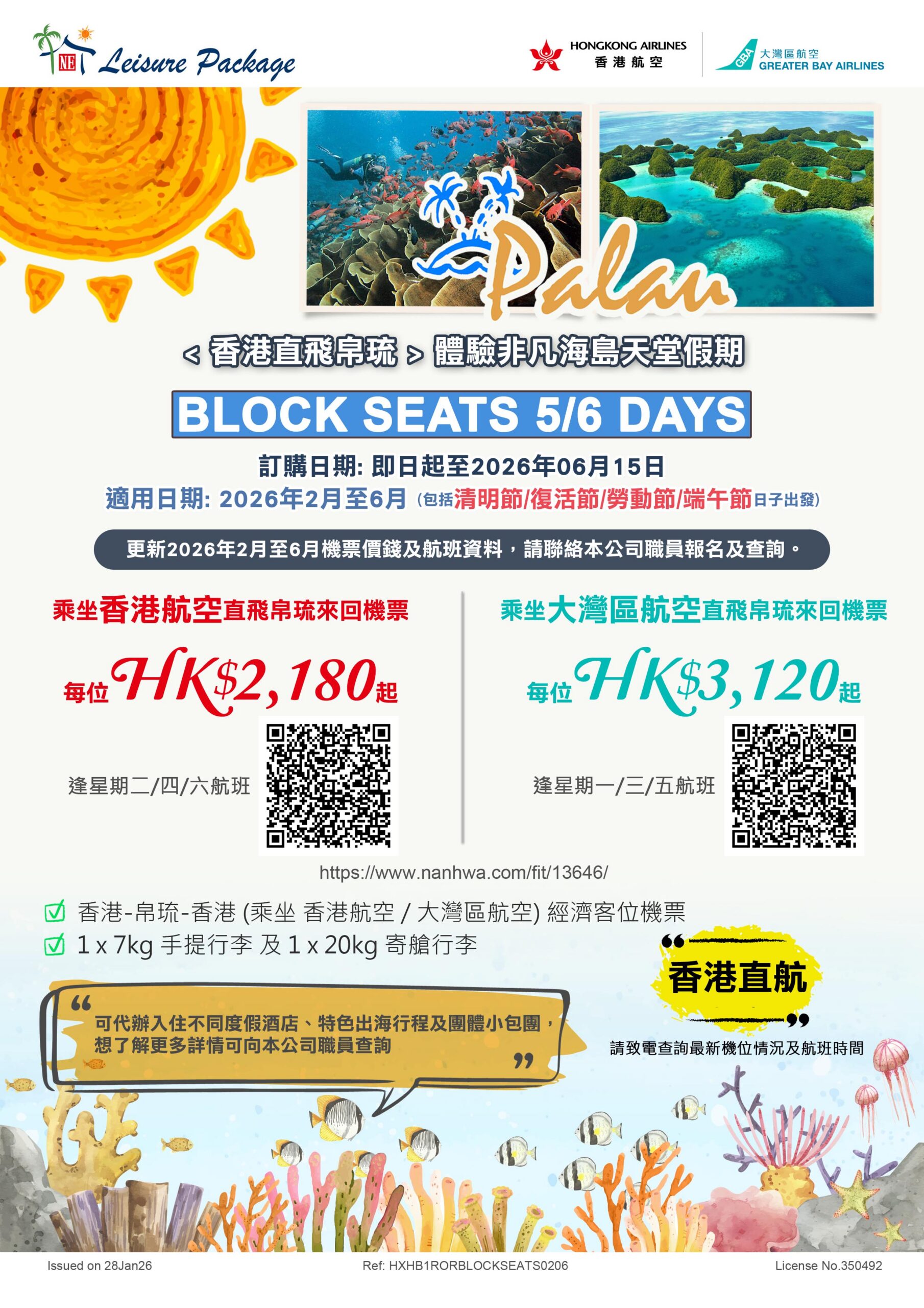 帛琉 · BLOCK SEATS 來回機票優惠 (香港航空/大灣區航空)