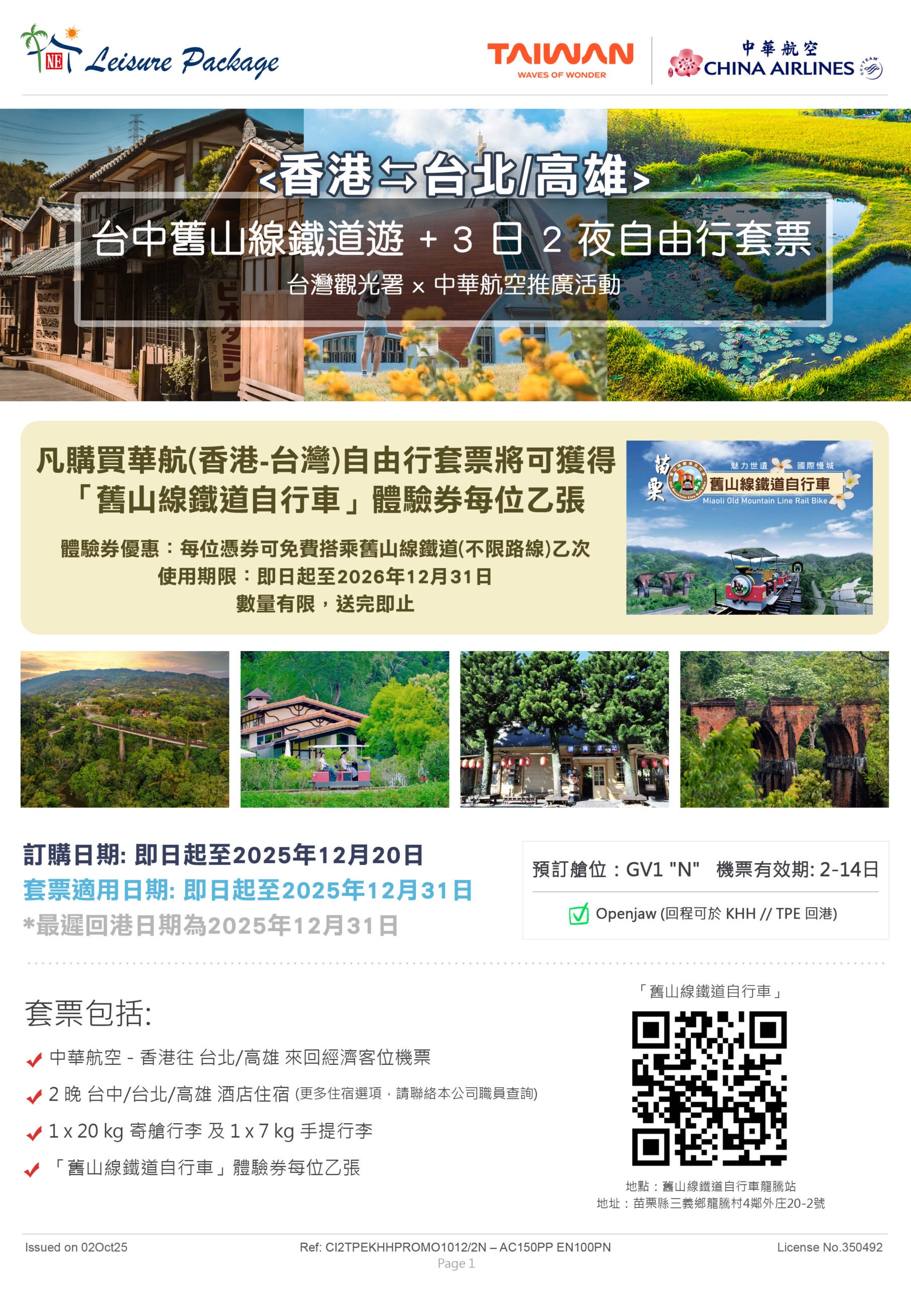 凡購買華航(香港-台灣)自由行套票將可獲得「舊山線鐵道自行車」體驗券每位乙張