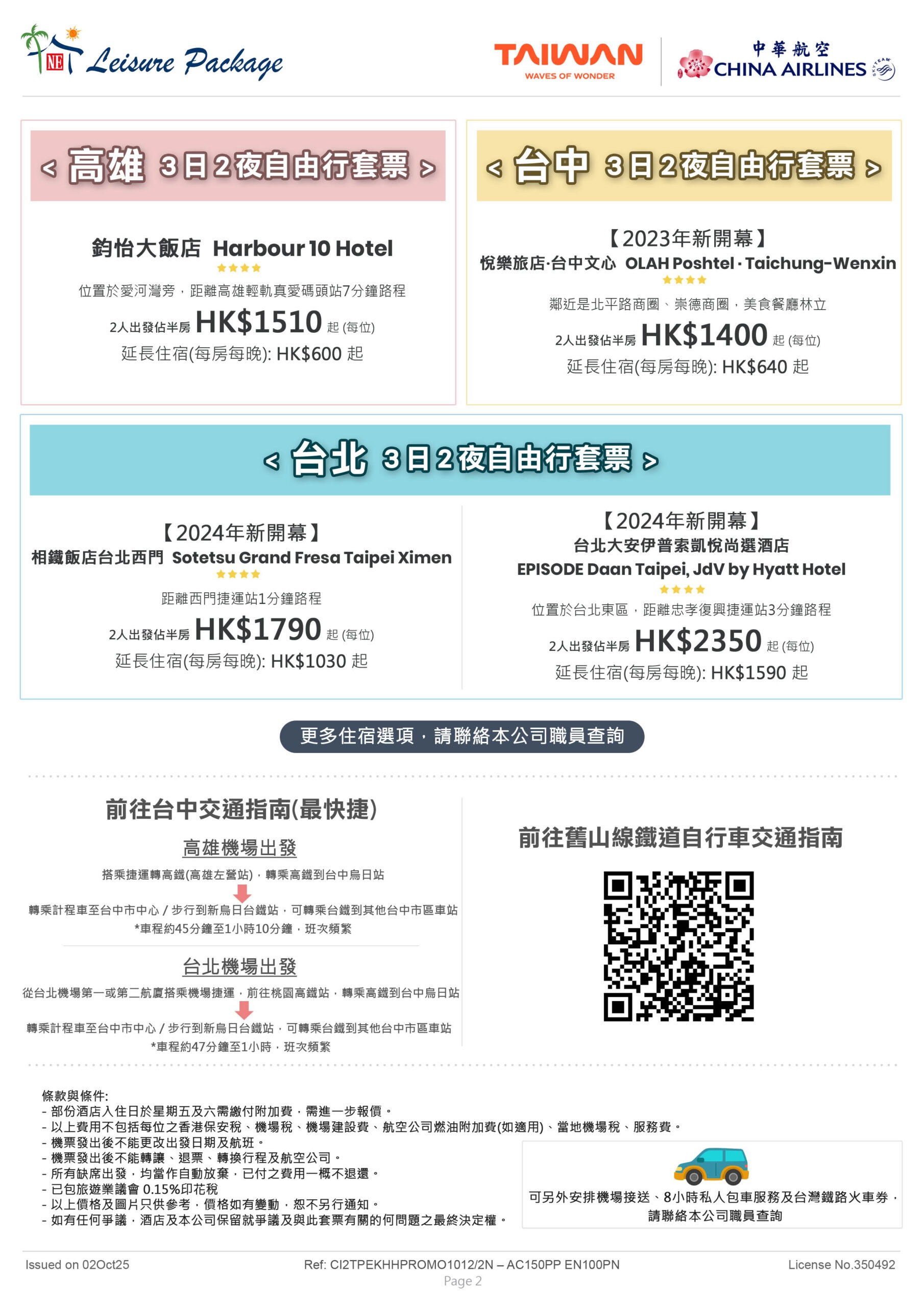 2 晚 台中/台北/高雄 酒店住宿 (更多住宿選項,請聯絡本公司職員查詢)