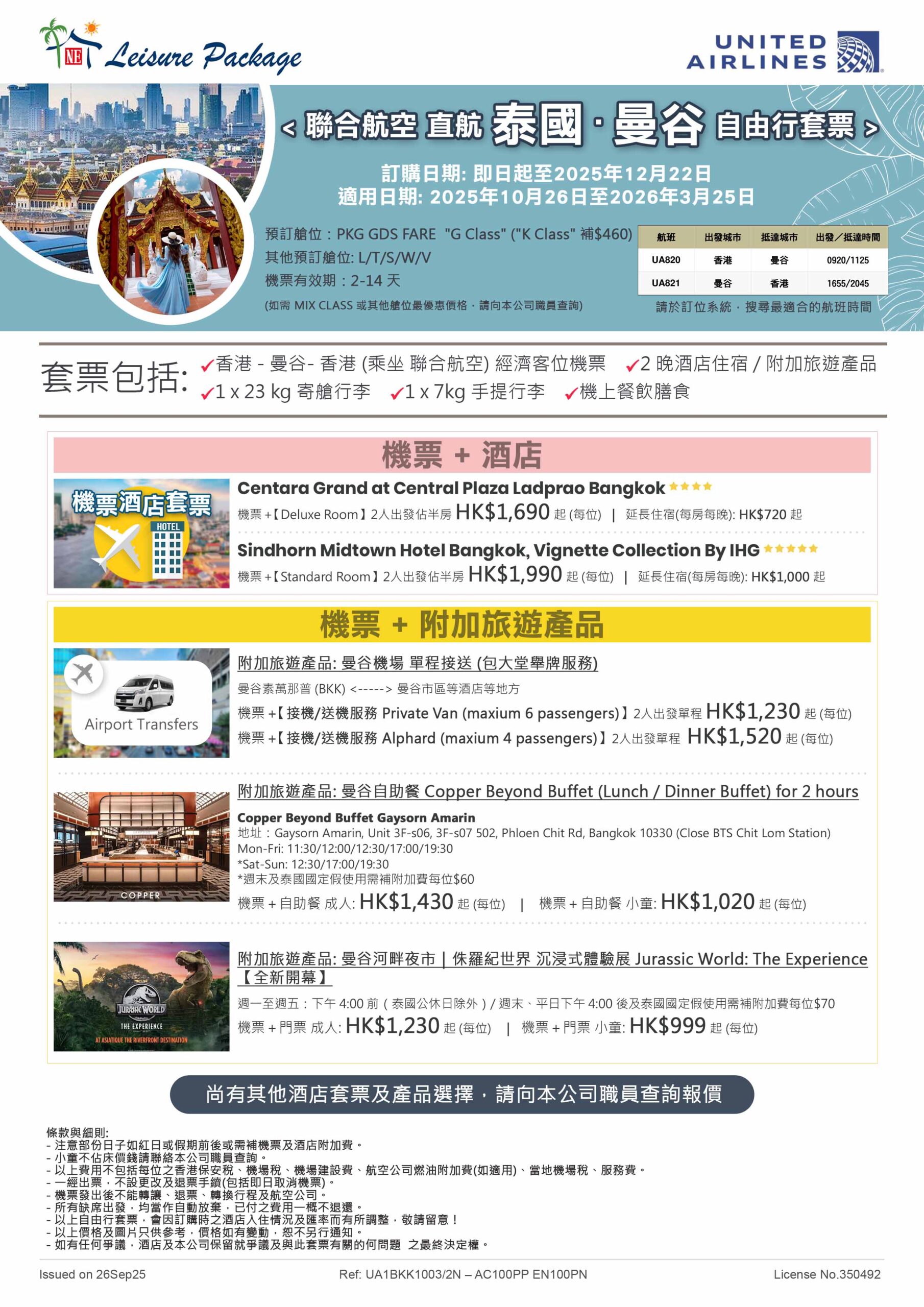 香港 – 曼谷 – 香港 (乘坐 聯合航空) 經濟客位機票