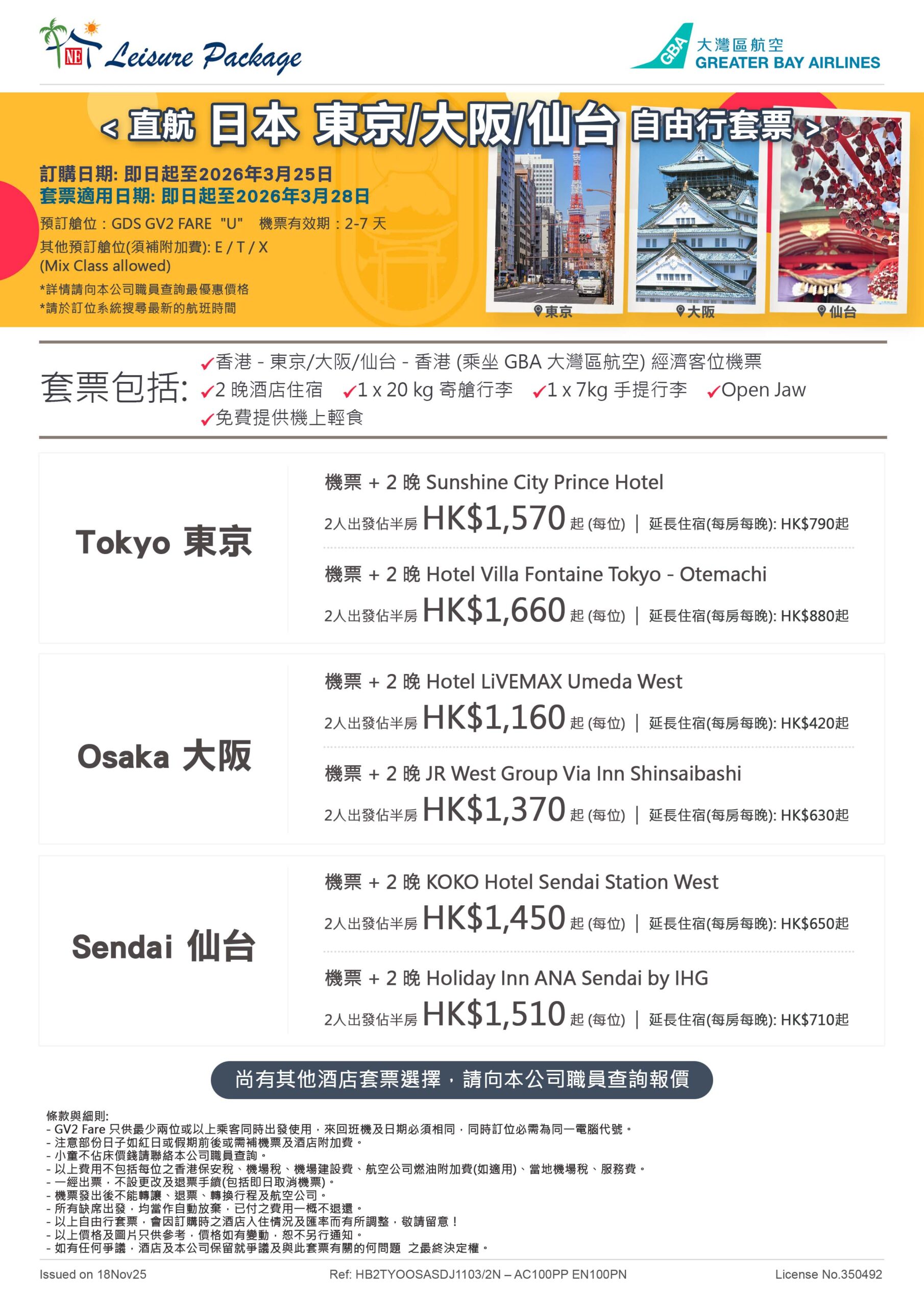✅套票適用日期: 即日起至 28/03/2026 (東京/大阪/仙台)