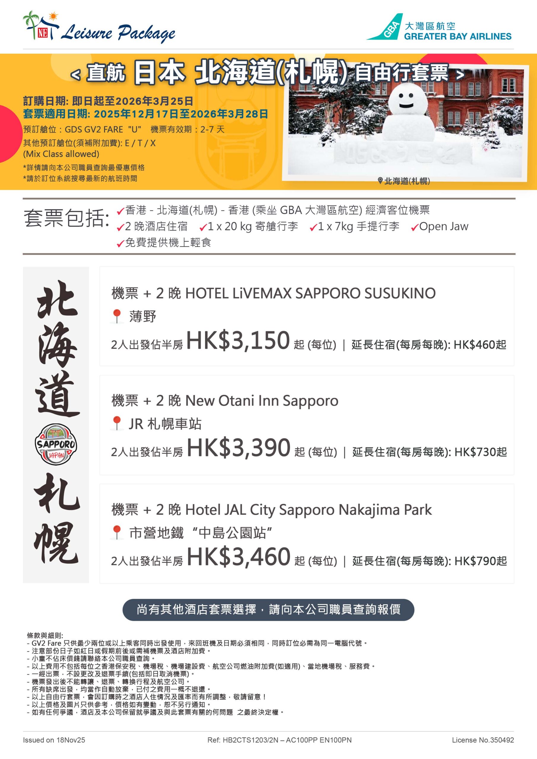 17/12/2025 至 28/03/2026 (北海道(札幌))