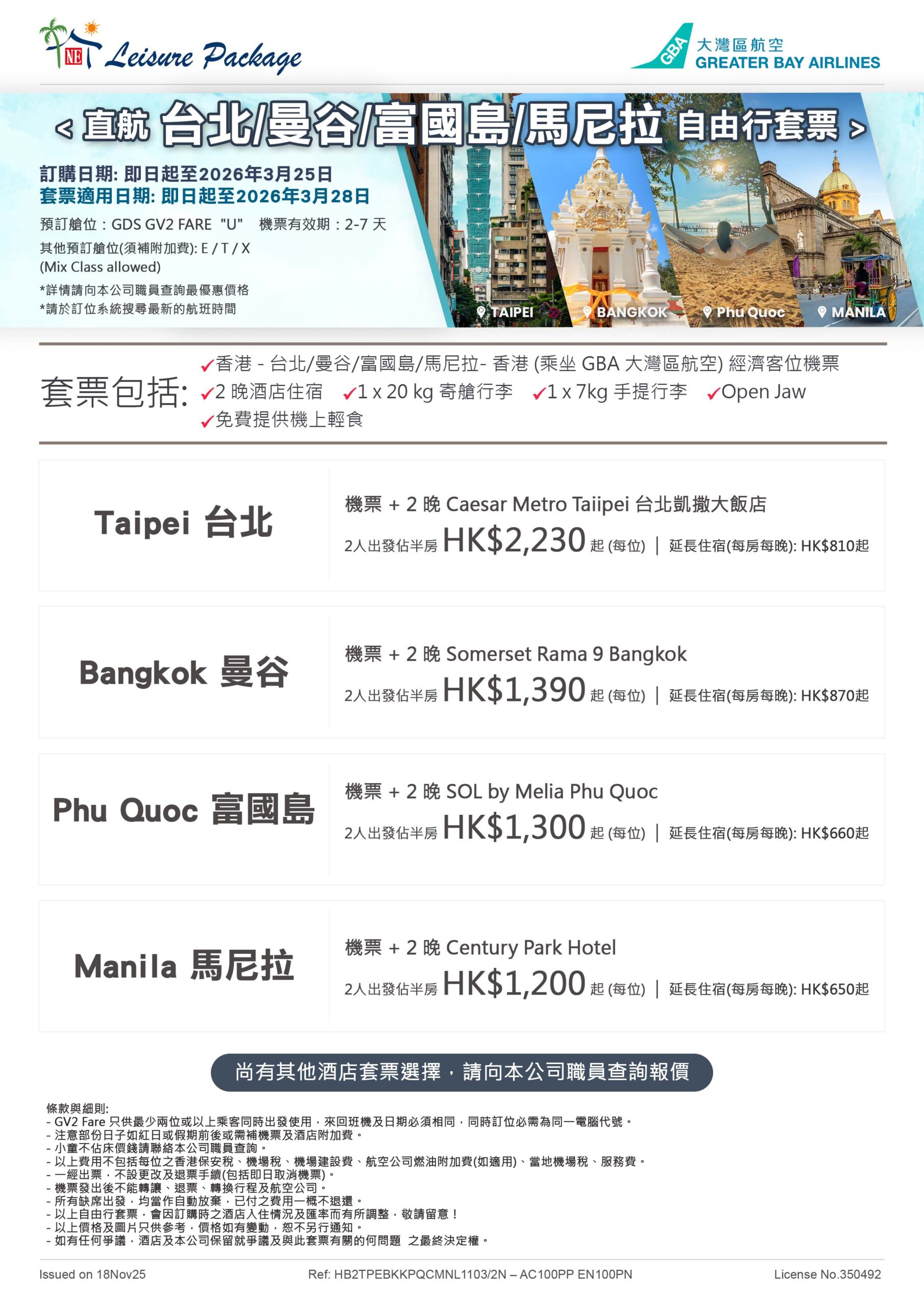 香港-台北/曼谷/富國島/馬尼拉-香港 (乘坐大灣區航空 Greater Bay Airlines) 經濟客位機票
