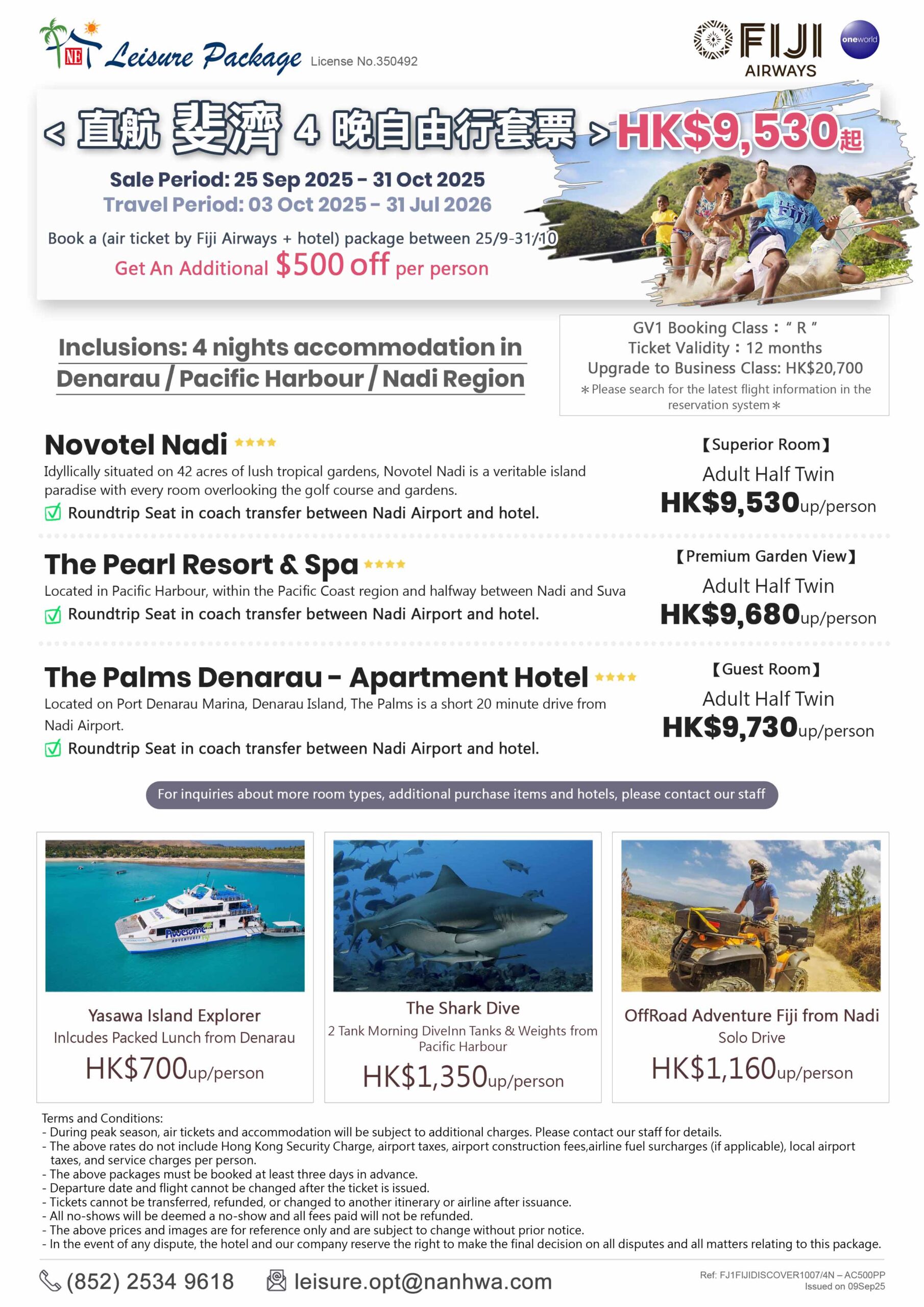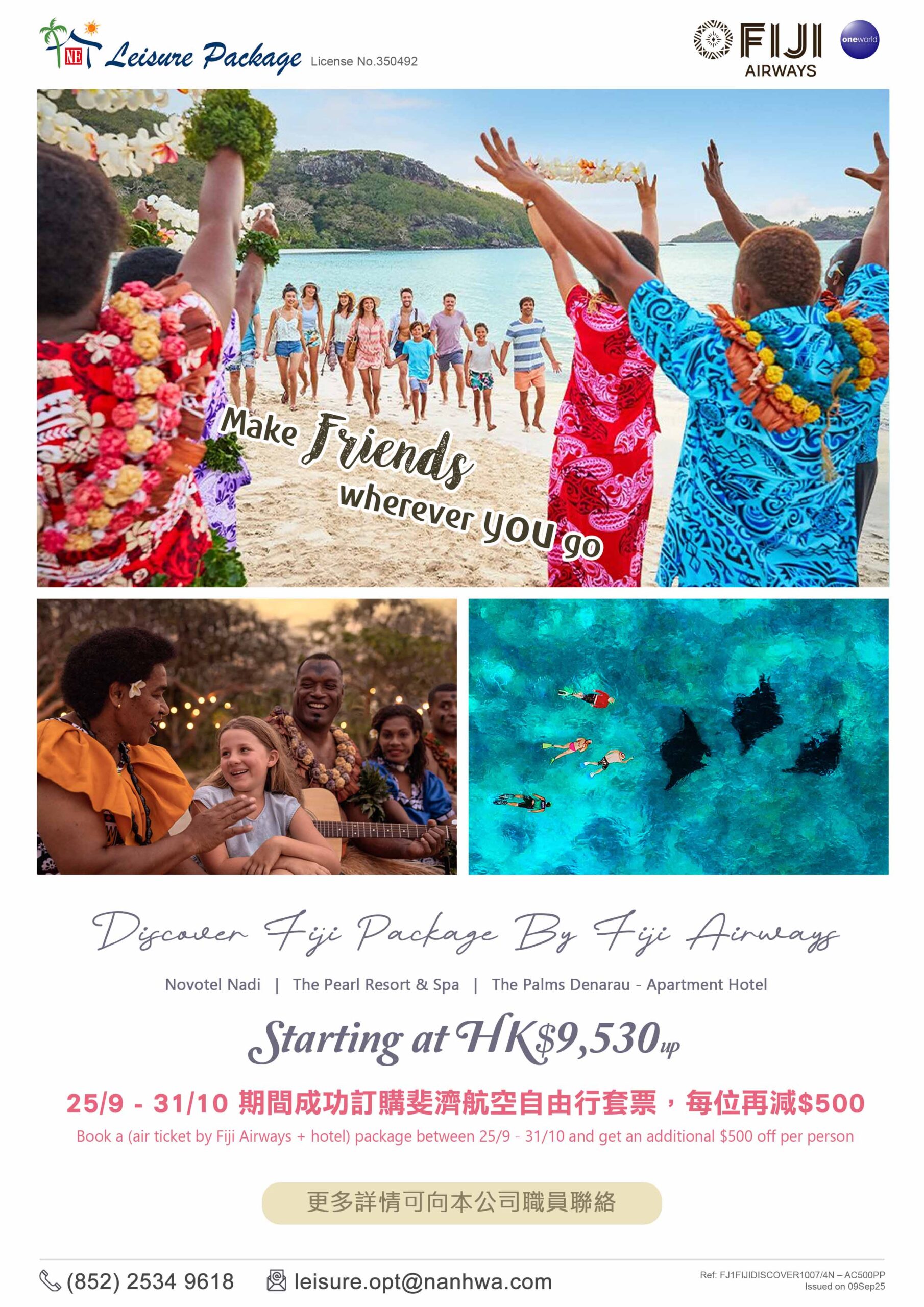 25/9 – 31/10 期間成功訂購斐濟航空自由行套票,每位再減$500