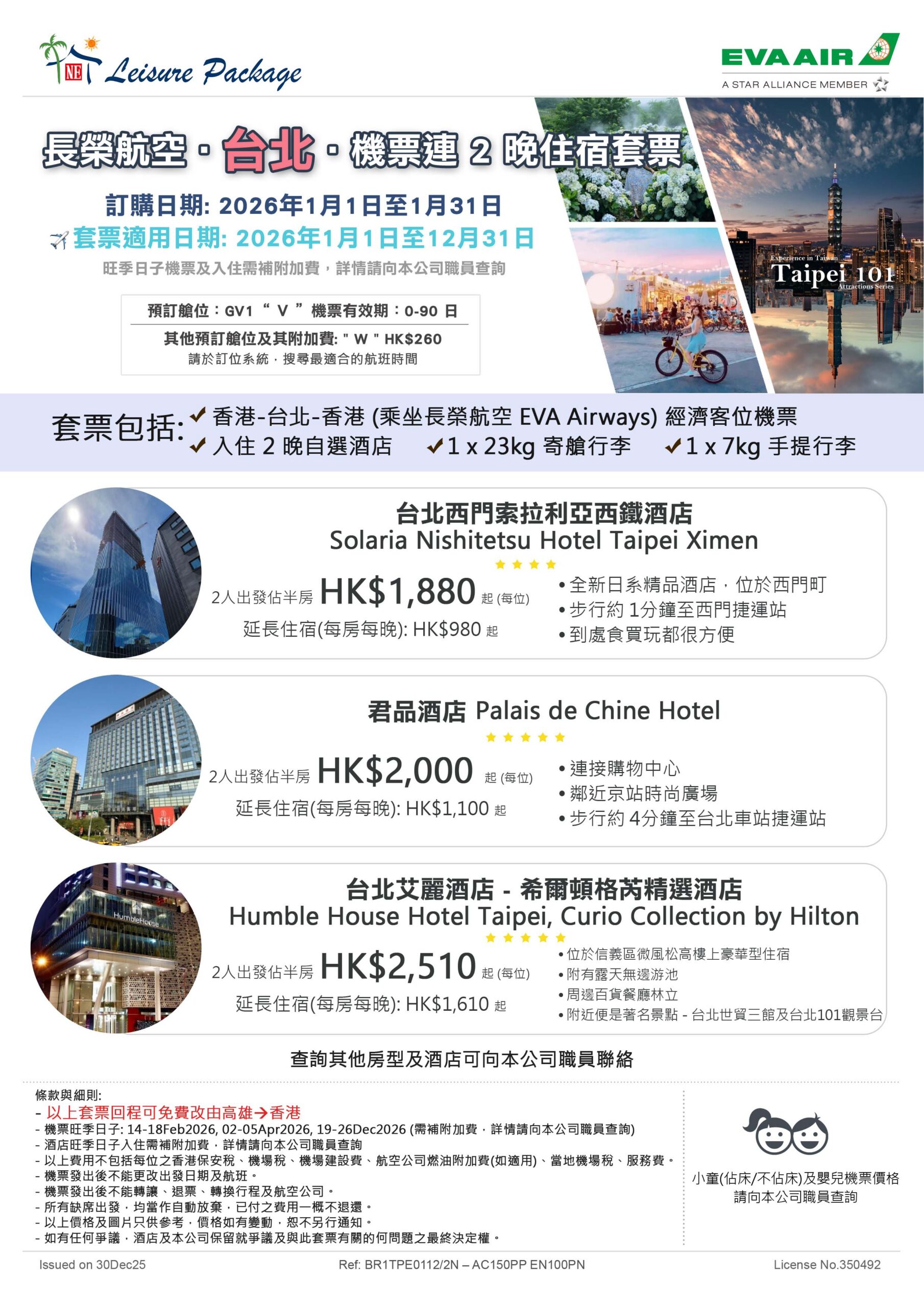 – 機票旺季日子: 14-18Feb2026, 02-05Apr2026, 19-26Dec2026 (需補附加費,詳情請向本公司職員查詢)